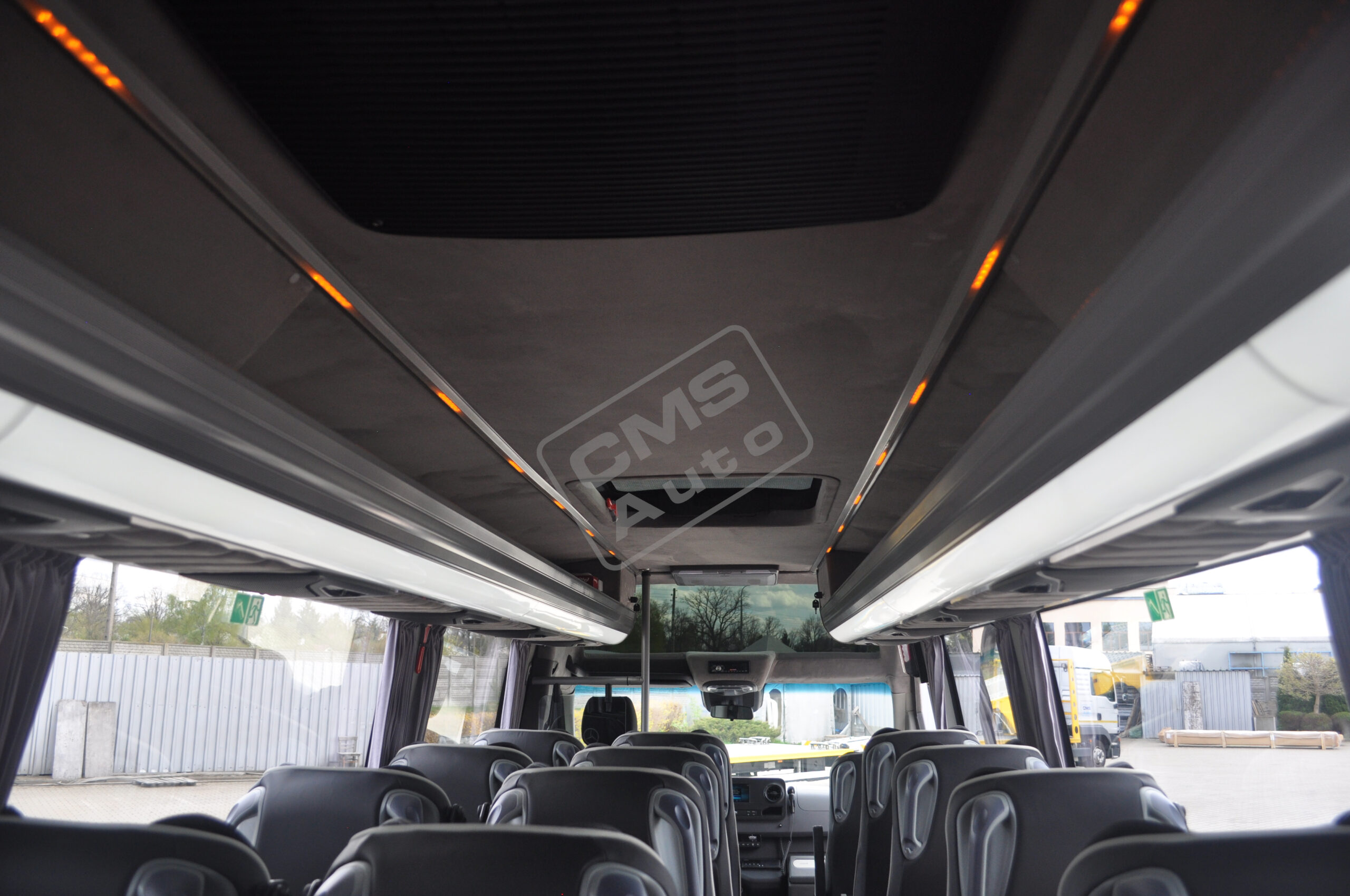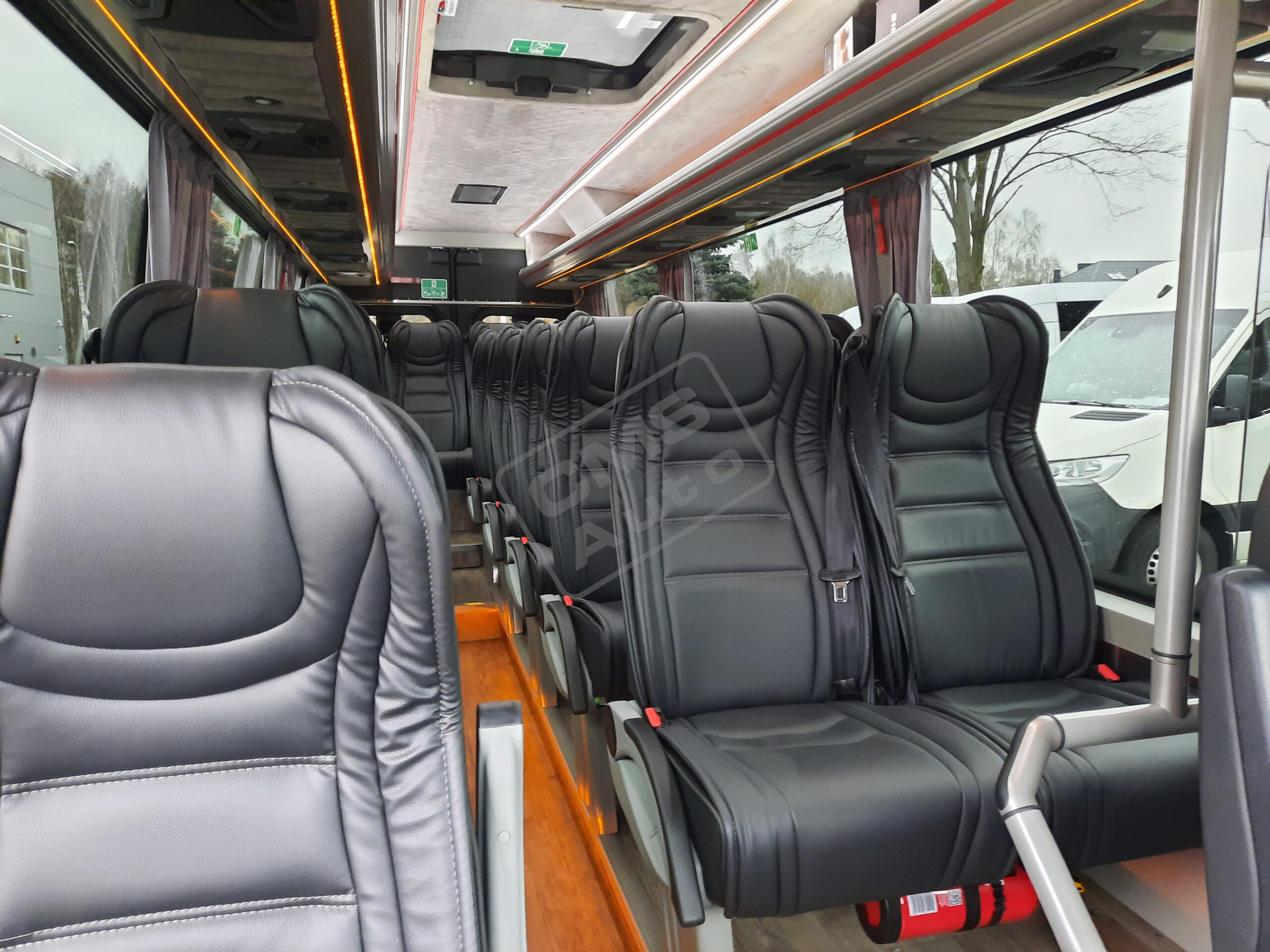 The travelers can take advantage of overhead lockers with side LEDs (night/daily mode) and panels, including customized air-condition vents, sound system and additional lighting.