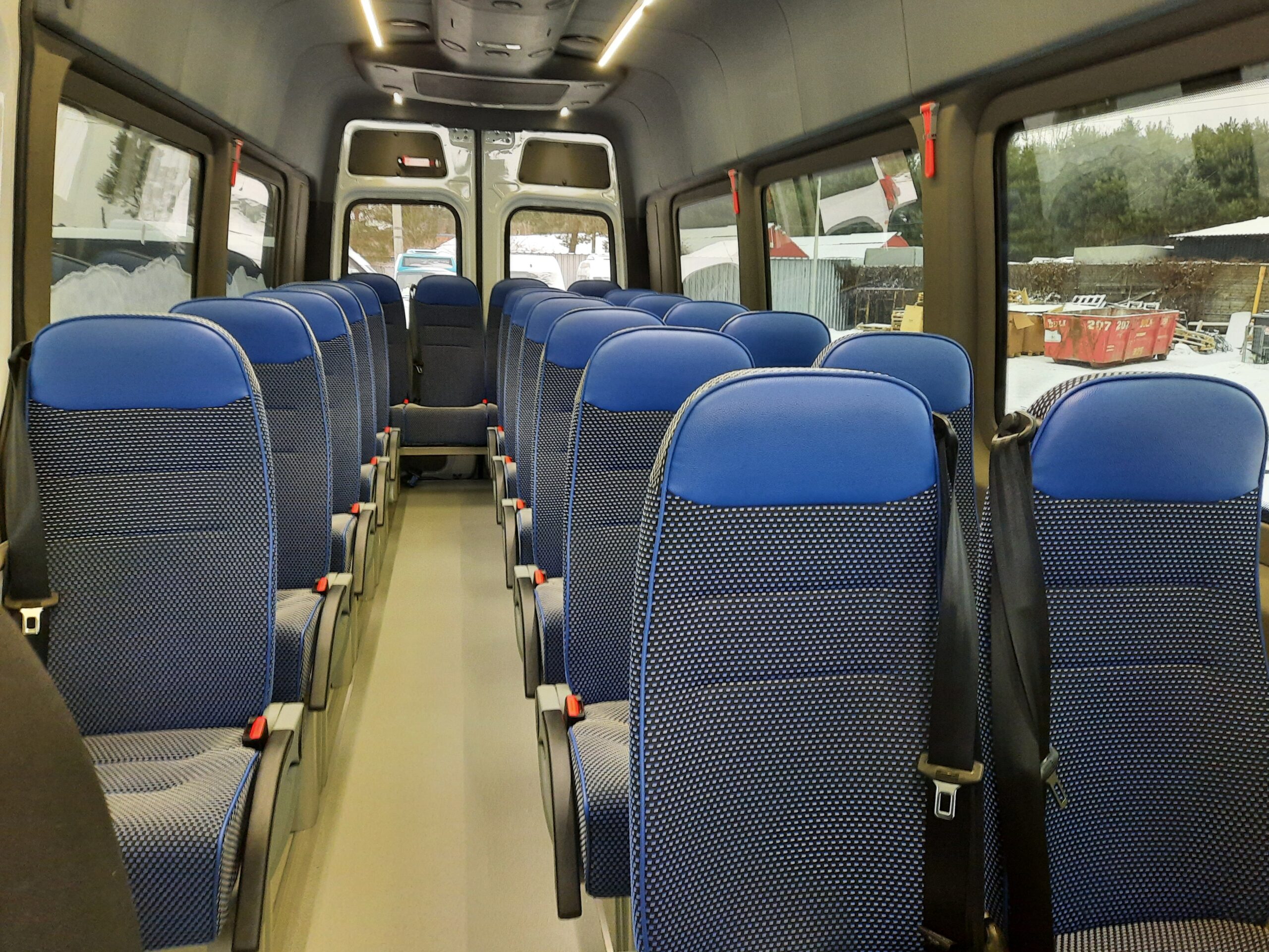 Oferujemy szeroką gamę tkanin tapicerskich oraz foteli uznanych producentów. Fotele montowane są na specjalnym podwyższonym podeście. W podeście montowane są nawiewy ogrzewania oraz specjalne oświetlenie do jazdy nocnej.